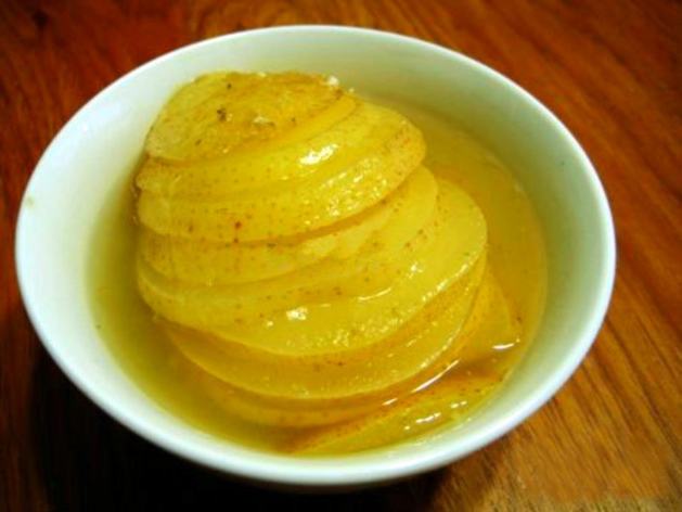 2)雪梨洗净,切成5毫米厚的片。