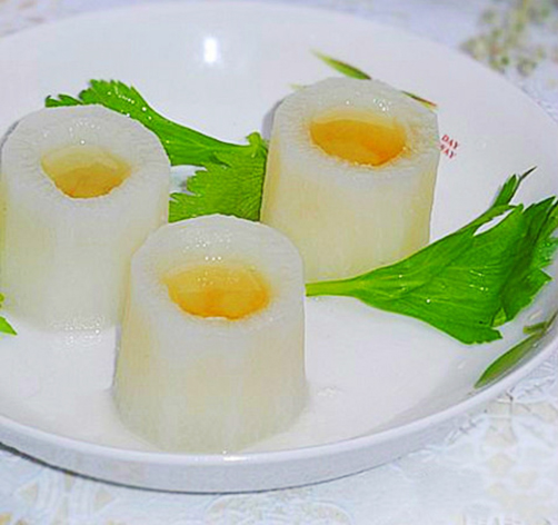 做法:1)白萝卜去皮,切成圆柱形。 2)每一个萝卜中间挖一个圆形的洞。3)把冰糖放到萝卜中间。4)放到锅里开始蒸,大火蒸半小时。5)萝卜端出来,放凉。6)每个萝卜加入蜂蜜即食。