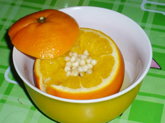做法:橙子洗净,切开一个盖,在橙子中间挖一个坑,把川贝放入去盖上橙子盖,放碗内摆蒸加上蒸2小时,放至温热食用即可。
