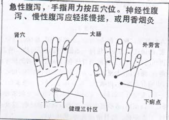 具体治疗方法: 治疗消化不良的区带是手心稍下的健理三针区, 因为该区是提高以胃肠为主的各种内脏功能的特效区带, 如给予充分的刺激, 一定会提高胃肠消化能力和整个内脏的功能, 再加刺食指根部附近的三间穴、食指第一关节掌側的大肠穴和合谷穴, 胃的消化功能就会不断提高, 温暖这些穴位, 香烟灸最好。