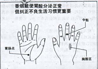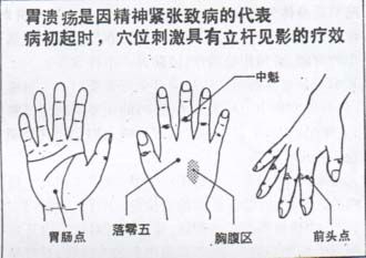 治疗胃溃疡的穴位: 胃肠穴, 手背的胸腹区,食指上的前头穴, 中指的中魁穴, 每天用香烟灸这些穴位 7- 14 次, 能抑制胃酸分泌。 所以胃的情况会渐渐变好。