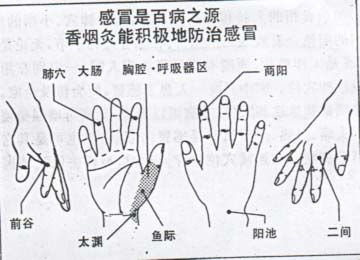 具体治疗方法: 位于食指的二间穴、手掌的鱼际穴、手腕的太渊穴三个穴位。 在感冒初期, 用这三个穴位治疗,可很快治愈。 把六到十二根牙签扎成一束, 用强刺手法治疗。