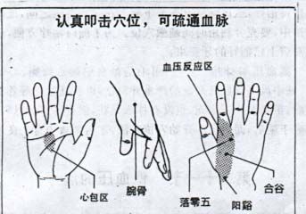 具体治疗方法: 用按压、揉掐或香烟灸下述穴位或区带: 手心、心穴、少商、少府、神门、太陵、太渊, 手背上的关冲、中诸、虎边、阳池、阳豀 共十二个穴位和区带。 坚持认真地按摩, 从手指到手腕, 从手掌到艘背, 坚持两到三个月, 身体状况一定会好转的。