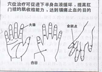 具体治疗方法: 用香烟灸会阴穴, 由于使肛门括约肌受到锻炼, 提高了肌力, 所以能很好地止住出血。 每天早晚灸 15 --30 次, 一定要耐心仔细地灸, 才能收效, 除会阴穴外, 手背上的合谷穴和手掌侧食指第一关节的大肠穴也是治疗痔疮的好穴位。 用手指按压这两个穴, 也会很快收效的。