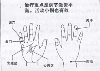 具体治疗方法: 其要点有二: 一是促进激素分泌,提高生殖器官机能, 二是消除心中疑虑。 提高生殖功能可刺激小指第一关节掌侧的肾穴; 加刺位于肾穴之下的命门穴, 手掌小指侧的生殖区, 手背的阳池穴;手掌中央的心包区、无名指指甲旁的关冲穴, 对安神宁心, 调节植物神经也有效。 每天用香烟灸这些穴位和区带 8-10次,同时在做家务活的空闲时间里, 认真仔细地按压这些穴位和区带, 更年期的种种症状一定会减轻。