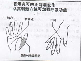 具体治疗方法: 手掌上有许多治疗哮喘有效的穴位。 哮喘穴, 位于食指中指分岔处的手掌上。 该穴是治疗哮喘穴位中最为有效的穴位, 哮喘发作时, 应首选此穴, 在家里, 用香烟灸很有效。 感到烫时, 把香烟从穴位上方移开, 隔一会儿, 再灸一次, 共灸 8 --16 次, 哮喘发作便会止住。