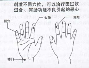 吃了腐败不洁的食物和没熟透的水果,或是因机体疲劳、精神紧张等原因引起的恶心和呕吐,不可避强止呕, 能吐则应尽量吐出, 此时, 应用提高胃肠功能和促进消化吸收的穴位, 这些穴位都在食指上。