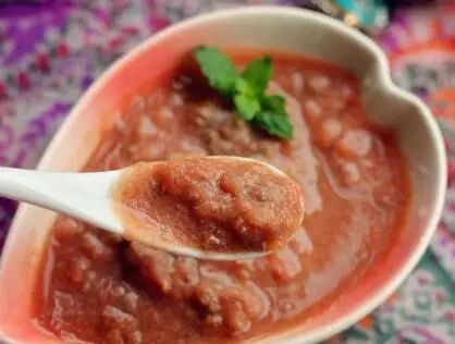 ●做法: 1、番茄洗净,开水淖一下好去皮,切块,捣烂成泥状;把新鲜猪肝洗净去掉筋膜,切碎成泥状。 2、将番茄泥与猪肝泥混合搅拌;准备好蒸锅,把番茄猪肝泥放入蒸笼蒸煮五分钟左右取出,再捣碎一些即可。