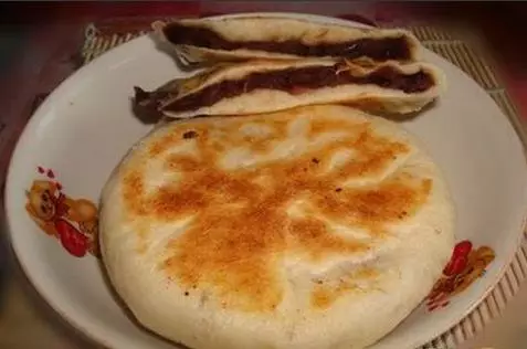 4. 放入豆沙馅,包成包子状,翻过来按扁。锅内抹一层油,放入馅饼,两面煎黄。