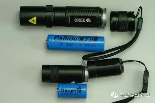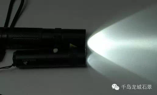 大电筒一般是用来照大籽,主要用来照摆件级别的籽,看肉里面的问题的,小电筒对付绝大多数的籽已经足够用了。这个大电筒配用的电池是2400毫安的,小电筒配用的电池是880毫安的,不放在一起比较的时候,觉得两个电筒都非常亮,放在一起一比较强弱立现。