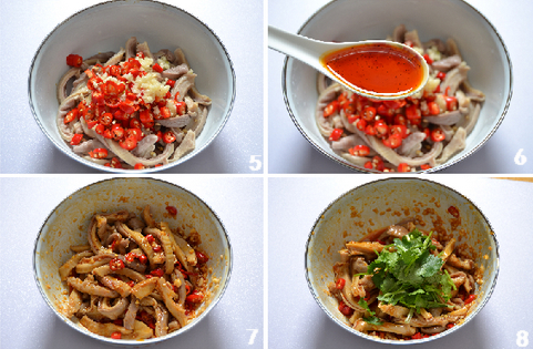 红油,由菜油加生姜、大葱、香叶、桂皮、八角、白寇熬成。也可用市售辣椒油代替、有的超市卖的半成品猪肚为块状,回家洗净后,以同样方法煮好后,切条。