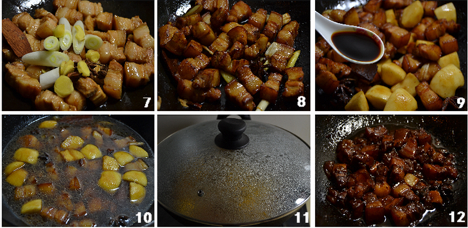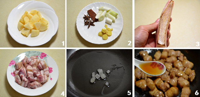 冰糖不能多,因为放了苹果。炒糖一定要用小火,冷油下锅,冒黄褐色泡,溢焦糖香就马上下肉块、五花肉块最好要煸出油,并且后续要用小火炒上色、加盖焖煮用小火,不要过量放盐。苹果丁要切小,煨化,能使整个菜更美观香醇。