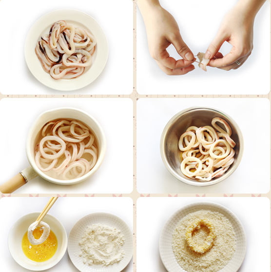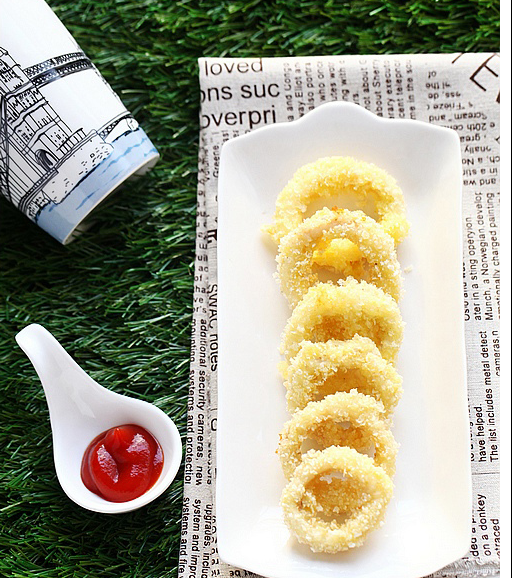 撕除鱿鱼圈表皮以去除腥味、用热水焯烫处理好的鱿鱼圈、在鱿鱼圈中调入盐、白胡椒粉、料酒和生抽,搅拌均匀,腌制15分钟、在腌制好的鱿鱼圈上蘸上一层面粉,随后裹上蛋液,再沾上一层面包屑、锅中倒油,中火烧至五成热,将鱿鱼圈依次入锅,炸制金黄色,捞出放在厨房纸上吸干油分、将炸好的鱿鱼圈摆入盘中,搭配番茄沙司食用即可菊花锅