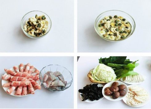 材料:羊肉500克、鲜鱼1条、菊花30克、白菜400克、油麦菜300克、豆腐200克、香菇150克、藕100克
