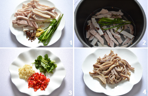 半熟猪肚250克 八角1粒 花椒10粒 生姜1块 香葱2根,香菜2根 鲜小米辣5粒 大蒜5粒 盐适量 红油(辣椒油)4汤匙,