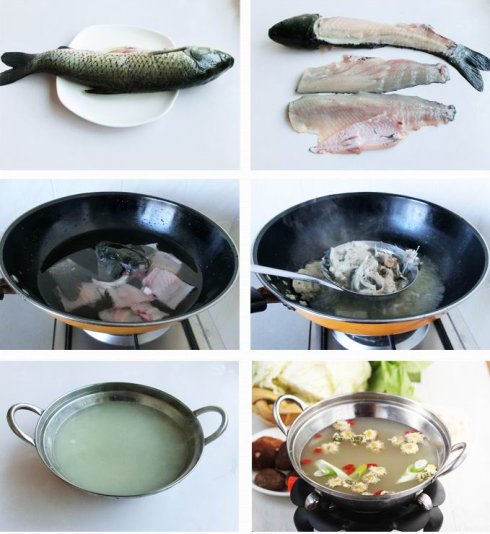 将菊花用温水浸泡五分钟后捞起备用 、将大部分鱼肉剔出,把剩下的留有少量鱼肉的鱼骨和姜片放入锅中,加入水,煮沸约30分钟 、捞取鱼骨,把汤舀入火锅内,作为锅底加入菊花煮沸约两分钟 、酱料的调制:芝麻酱2勺加清水调开,再加甜面酱1勺、花椒油1勺、韭菜花半勺、腐乳半块、辣椒