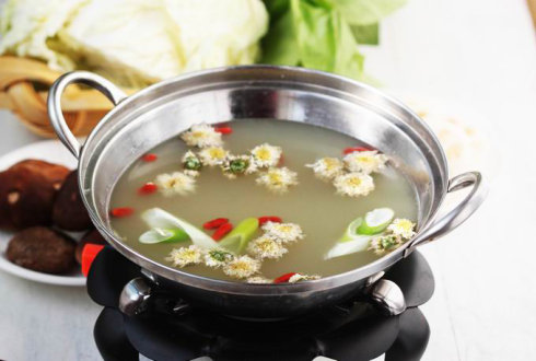 菊花火锅汤底用鸡、鸭、猪蹄、猪骨、金钩、瑶柱等熬的汤,待到汤烧至滚沸,取洗净的白菊花,投入火锅中,顿时菊香飘逸。