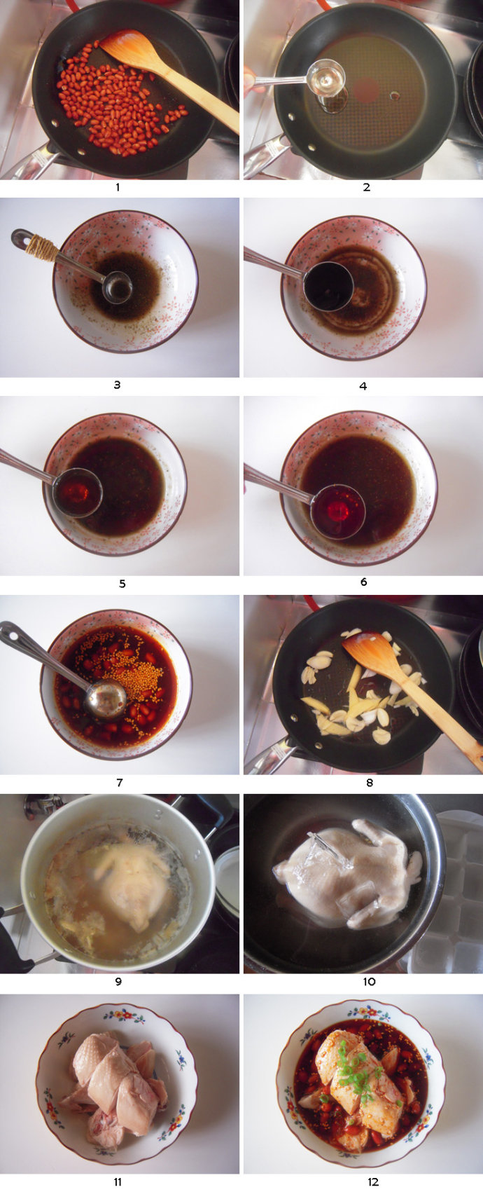 干锅、小火将花椒粒炒出香味后取出放凉、撵碎。锅里再倒油,小火炒熟花生米,取出来放凉.锅里重新倒入1大匙的油.待油烧热后浇在撵碎的花椒上,花椒油就做好了.继续加入1大匙的酱油和1大匙的料酒.继续加入1.5茶匙的陈醋、1大匙香油、1茶匙白糖。搅拌均匀.按照个人的喜好加入辣椒红油.最后加入1茶匙熟芝麻和炒好放凉的花生米,基础调味汁就做好了.锅里炒香葱段、姜片和蒜片,关火.大锅里烧开热水,加入刚刚炒香的葱姜蒜片。待水完全沸腾后放入整鸡,盖上盖子中火煮12分钟,关火后不开盖、焖15分钟.取出后立刻放在冰水里冰镇15分钟.剁成大块儿盛盘.在步骤7里做好的汁儿里加入2大匙鸡汤和少许的盐,搅匀即可。把鸡块泡在里面,放入冰箱保鲜,1个小时以后食用更佳。