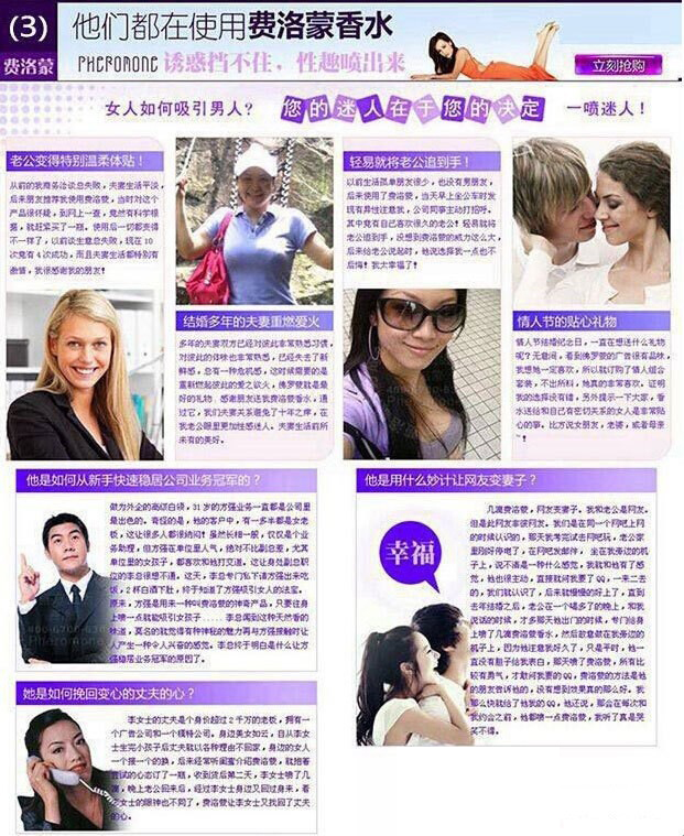 【女用勾男】它无色无味无形无迹,任你如何敏锐的感官都无法捕捉到它,可是你却能用心灵聆听到它,就像是来自生命原初的第六感,一种致命的吸引,而这也正是所谓的爱情真 相。它露而不彰,彰而不显的气质,能让你在无形中让对手产生好感。不管是办公室谈判桌前的唇枪舌剑,还是卧室里床弟间的男女之欢,它所散发出的女性独具的 动感魅力,能让你所向披靡,无往不胜。原装正品,质量之优、放心享用!