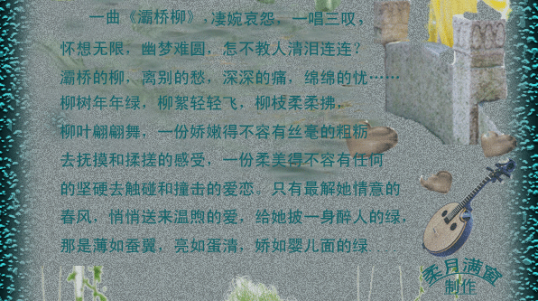 [ft=,,][ft=#33ffff,,][ft=,,楷体_gb2312]一曲灞桥柳,[/ft] [ft=,,][ft=,,]多少情和愁。[/ft][/ft][/ft][/ft] [ft=#33ffff,,楷体_gb2312]流水止欢笑,[url=http://sz.photo.store.qq.com/rurl2=5215feb9003cd6be74294ed5ae7cb6d6997fdbd144c7803996045ecbbd42c00cb22803ca413d04d698c5cc3716b1b5563566b75cf565841ac7caebba891151566f5db1e507362882fd792dee3fd584eef3fb5070][img,51,51]http://b5.photo.store.qq.com/rurl2=5215feb9003cd6be74294ed5ae7cb6d6997fdbd144c7803996045ecbbd42c00cb22803ca413d04d698c5cc3716b1b5563566b75cf565841ac7caebba891151566f5db1e507362882fd792dee3fd584eef3fb5070&ek=1&kp=1&pt=0&su=1219478736&sce=0-12-12&rf=2-9[/img][/url][/ft] [ft=#33ffff,,楷体_gb2312]小树也低头。[/ft] [ft=#33ffff,,楷体_gb2312]听了多少遍,[/ft] [ft=#33ffff,,楷体_gb2312]仍在屏中留。[/ft] [ft=#33ffff,,楷体_gb2312]此曲只应古时有,[/ft] [ft=#33ffff,,楷体_gb2312]然何声声出自我心头?[/ft] [ft=#33ffff,,楷体_gb2312]剪不断的爱,[/ft] [ft=#33ffff,,楷体_gb2312]悲切泪难收。[/ft]