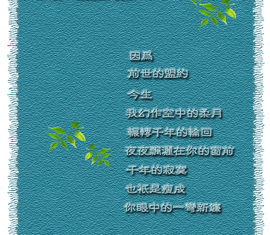 [ft=#cccccc,3,楷体_gb2312][U][B]风花雪月 以是浮尘红楼 今生注定会踏进一条河流 悔也未悔 逃也未逃 就悄悄的站在角落 为君斟满一杯浓酒 [/B][/U][/ft]