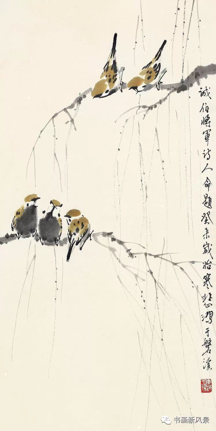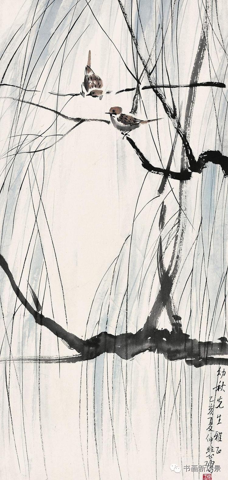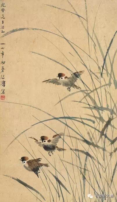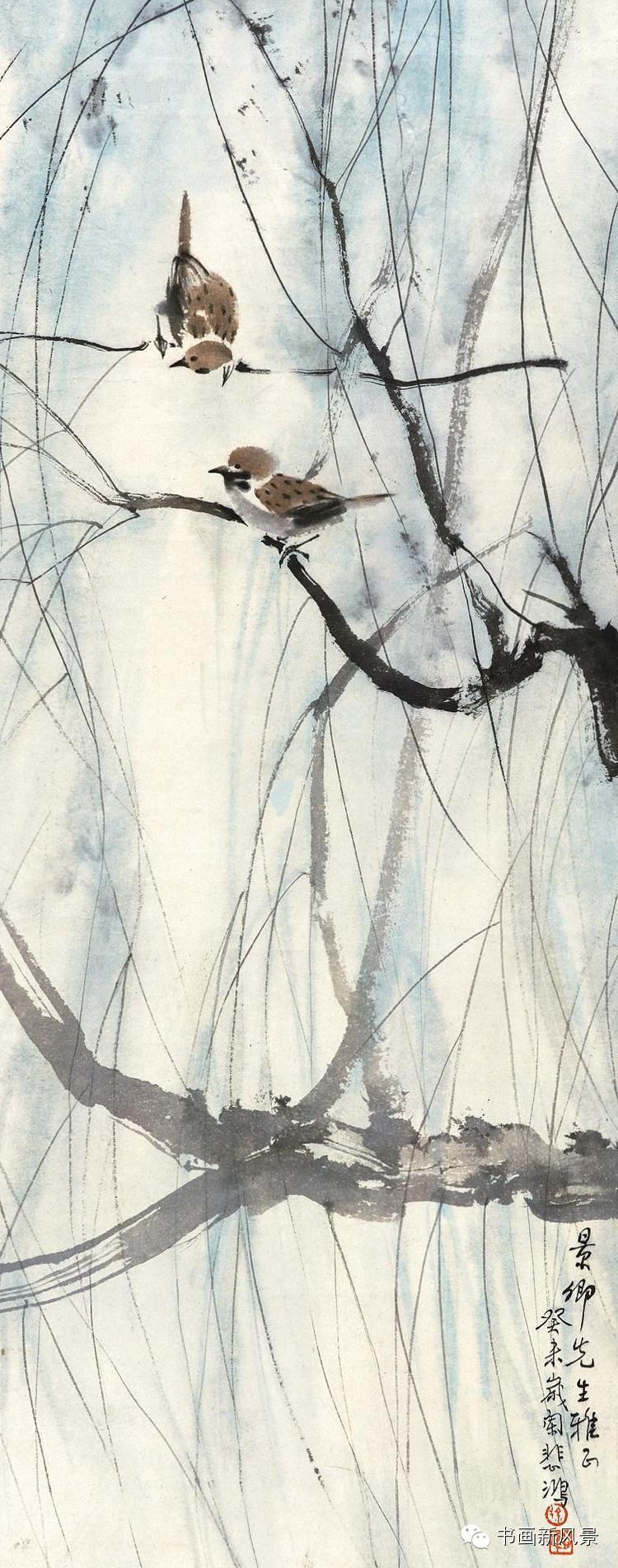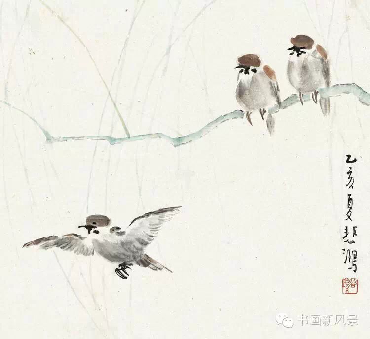 这幅《芭蕉麻雀》,阔笔写意的蕉叶墨色浓谈与阴阳向背颇为讲究,麻雀的造型富体积累,没骨草地融水彩画技法,画面清新可人,富有生机,也体现他融合中西、师法造化的艺术主张。