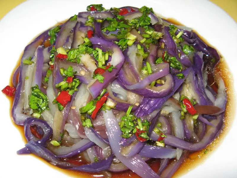 1.茄子在锅中蒸熟,晾凉后用手撕成条