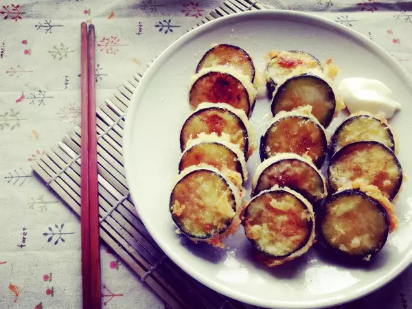 2.附上让茄子少吸油的小窍门,首先把茄子放有少许油的锅中,让一面的面粉糊定型煎熟,马上翻面让另一面淀粉糊也熟,然后就利用温度和茄子表面吸的少量油继续把茄子烘至断生即可,需要翻一次面,很简单,但是注意一定要用不粘锅