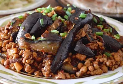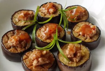 18.蒸熟的茄子放在另一个盘子里,把肉末放在茄子表面