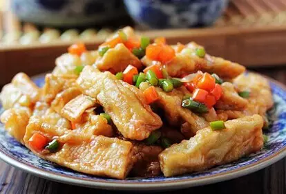 18.加入炸好的切条下锅翻炒,使每根切条均匀裹满料汁即可