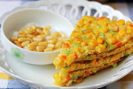 甜玉米 1碗、淀粉 3茶匙、鸡蛋 1个、胡萝卜 半根、黄瓜 半根、松子 1把、植物油 2汤匙、白糖 2茶匙
