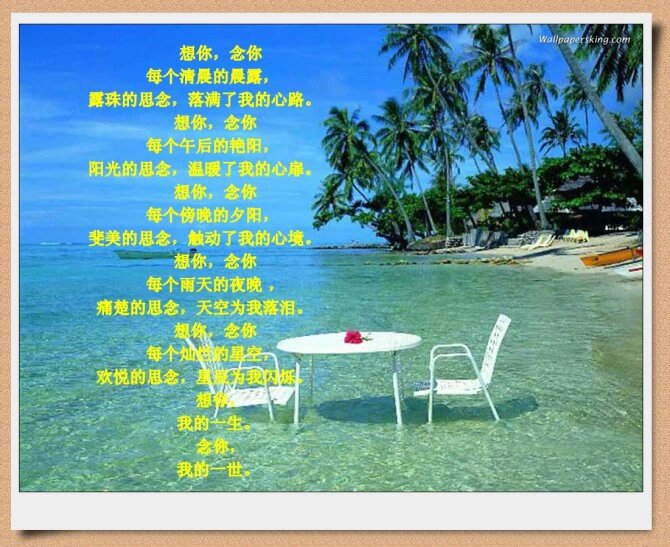 [ft=,4,楷体_gb2312][B]想你念你 ,是那样美丽。想你念你,是那样甜蜜。想你念你,一缕情思总在心里。想你念你,在如水的梦境中回忆,真想乘风归去。[/B][/ft]