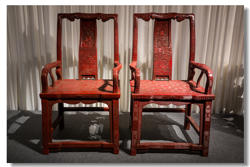 剔红山水花鸟图南官帽椅 清中早期,剔红即指红雕漆,以木为胎,披麻挂灰后髹漆数十乃至数百遍,然后进行雕刻的漆工艺。