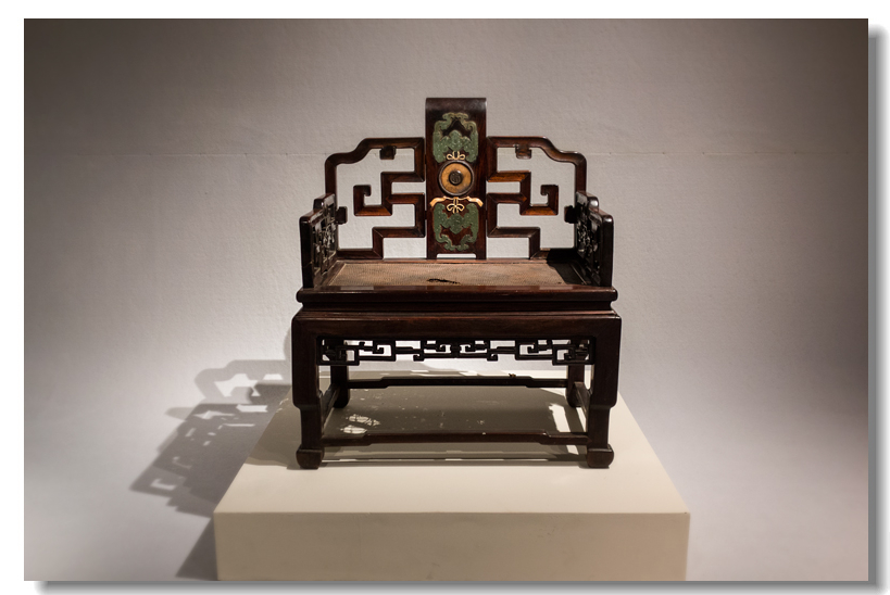 红木嵌玉蝠纹宝座 清中晚期 ,宝座嵌石面,为广州一带制品。该宝座工艺精湛,装饰华美,应为官宦之家所用物件