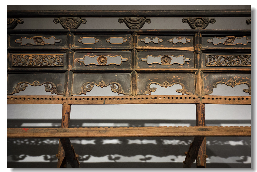 榆木寿纹排椅 明或清早期,榆木制作的排椅,在山西与陕西交界的寺庙中常见,为礼佛上香的信众休息之用,又称庙椅。