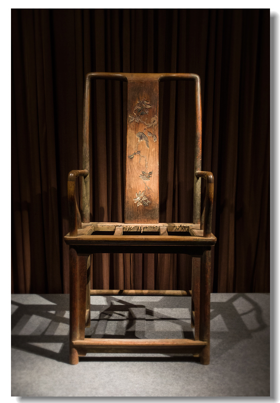 黄花梨嵌百宝花鸟纹南官帽椅 明末清初,此类百宝嵌的南官帽椅,传世所见的目前仅十一件。该椅因年代久远而缺失,但残留的轮廓依然清晰。造型文件峻峭,各个部位处处用心,比例极佳,为高手所制。