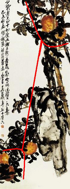 2、三线体:就是构图以主线、辅线、破线三条线作为主要构成的手法。树干主干的走向是构图的主线,另有衬托的枝干随主干走向辅排,起著陪衬辅助作用,即辅线。然后另出旁枝从主线破出,使构图多样变化,这根线就叫破线。主线主导著画中气脉走向,而辅线则增加层次,破线用于对主线进行反衬,更加明确画面的主、次关系。