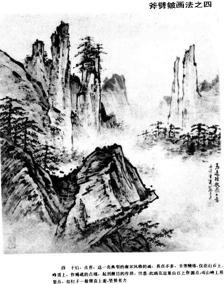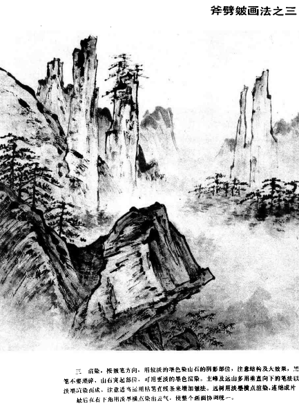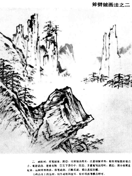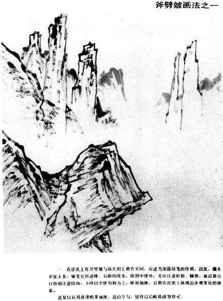 斧劈皴:斧劈皴也称为拖泥带水皴,有大斧劈和小斧劈之分,斧劈皴的笔痕如同刀砍斧劈的形状,主要表现雄奇坚硬的山石肌理效果,大斧劈是一种简练,概括,豪放的山石皴法,其画法是勾皴结合,边勾边皴 ,一气呵成。画时将笔卧倒侧锋,下笔痛快有力,用笔方向可以多变,笔痕宽窄顺势而为之。让笔痕自然渗化,但不易重复修改。在皴法之中,趁湿用中锋笔剔线或勾框,以明确山石外形及内部结构,使轮廓线与皴法相互交融,浑然一体。斧劈皴要做到水墨淋漓笔痕清晰,下笔利落简练,但又不失厚重之感。调墨时,笔头要有浓淡变化和充足的水份,大胆落笔,小心收拾,方能画出淋漓酣畅,生动自然的效果。小斧劈画法与大斧劈相近,只是笔触小一些,用毛笔前半部分侧锋为之,笔头水份不易过多,皴法多出干笔及飞白,用笔注意变化,笔触不易平摆,要松紧聚散,谨防呆板。