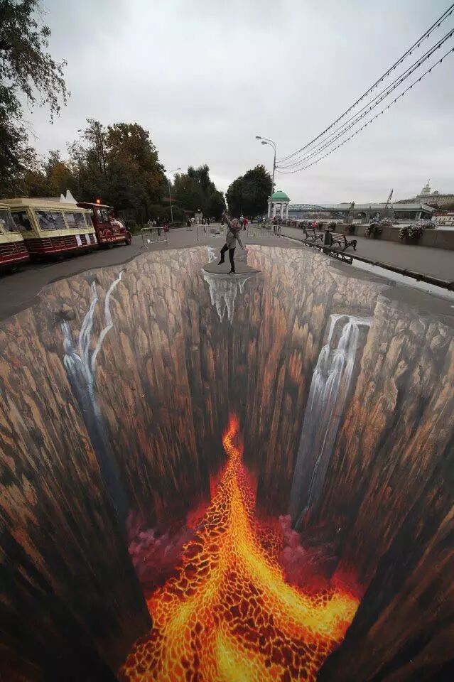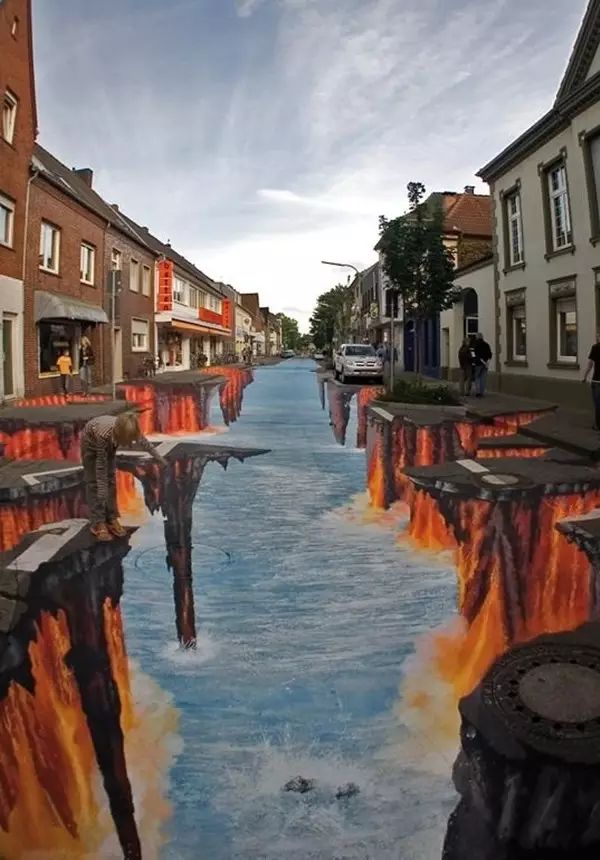 别怕,这些只是画在地面上的3D涂鸦。但画得太逼真,走上去还真会吓那么一跳!