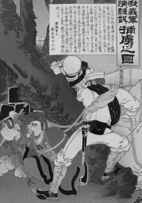 日军宣传画,内容为朝鲜战场上的日军抓获携款潜逃的清军军官,原标题为“我义军俘虏清钱奴之图”。