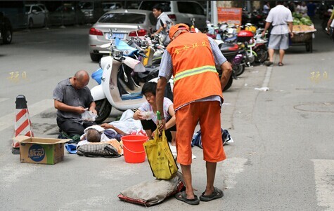 张先生"团队"成员(前文有见)。女子不停磕头祷告,因天气炎热,不一会就汗流浃背。见有行人给了20块钱,遂向前寻访。那人说自己家人在附近的医院住院,看到他们躺在那里,身旁还放着药,觉得挺可怜,就想帮帮。并表示假设是骗人的,20块钱对他来说损失也不大。