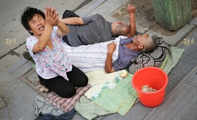 无奈出师不利,半个小时后就被商场管理人员请走。见此情形,三人将阵地转移到花园路国贸360停车场入口附近的空地上,此地正是人流车流密集区,紧邻国贸商圈,属上品绝佳地段。因半下午喝了酒,张先生和老人不多时就躺在地上呼呼睡去,连桃子都没啃完,独留叶女士一人磕头祷告。