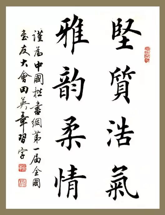 大楷: 一般情况下,人们把一寸以上、数寸以下见方的真书称为大楷。较此更大的真书大字被称为“榜书”、“擘窠书”。根据历代书法家积累的经验,学习书法应先写大楷,作基本练习。掌握好大楷的点画、结构、布白,做到点画准确精到,结构疏密得当,则退而写小楷可做到结体宽绰开张,点画规矩清楚;进而学榜书则能结密无间而气魄宏阔,不致涣散无神。