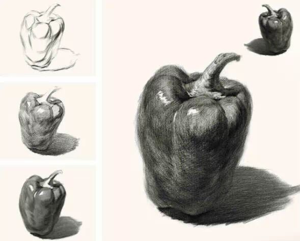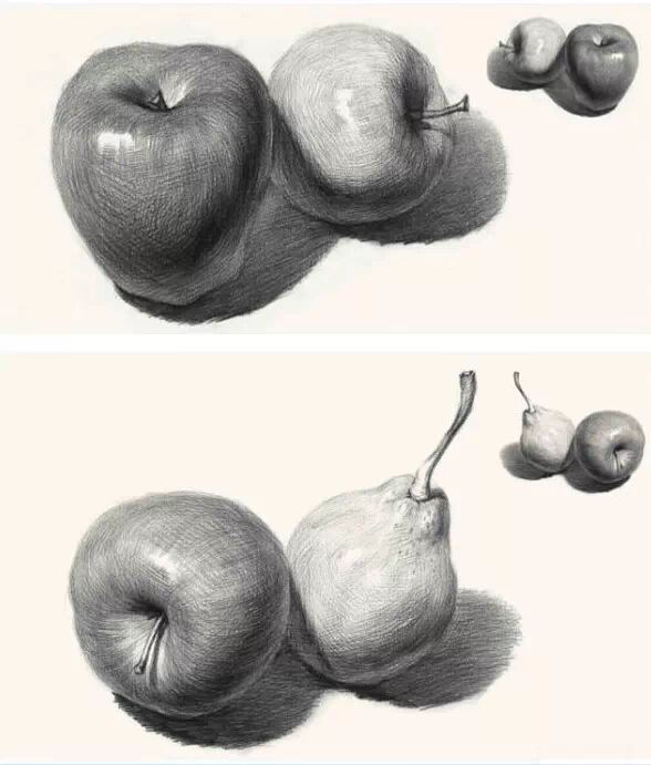 还有就是梨子和苹果都是自然形,并非工业化制造,所以形要自然生动,不要概念化。并且他们有自己独有的特征。固有色也要进行适当区别,更是丰富画面黑白灰层次。