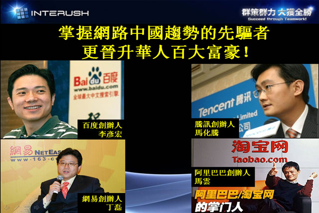 ——这些都是我们中国人的骄傲:二十年前他们并不是什么“富二代”,也不是什么“官二代”,都一些聪明绝顶的穷光蛋。通过互联网这个行业创业,短短十多年的时间兑升为全球华人的百大富豪!