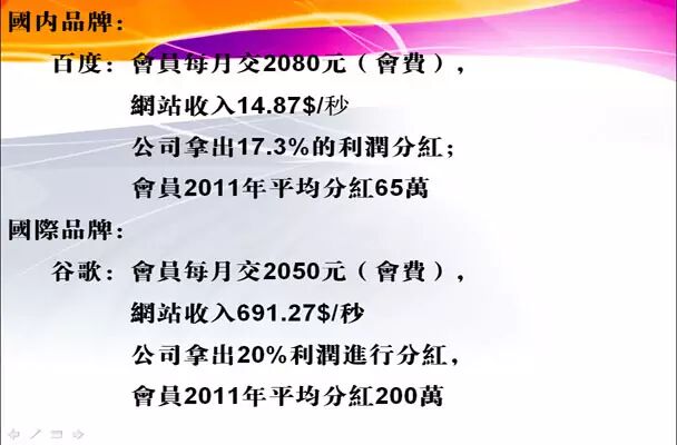 ——利益均占:公司拿出全球50%的净利润,分配给所有的联盟会员;50%分配给股东、大财团以及老板,是各占50%。