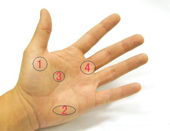1、鱼际穴:大鱼际中间点,靠近骨头的位置。