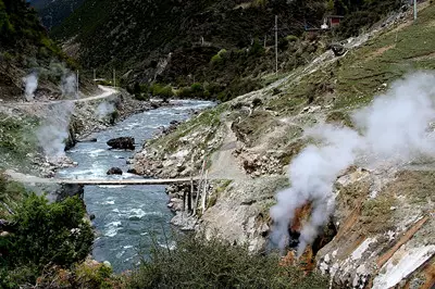 【热坑温泉】沿着巴曲河顺流而上,从措拉进入措普沟自然风景旅游区8公里,即是茶洛乡的热坑,无数大小不一的热水活泉眼,其温度达90℃,形态各异,撒落在山坡上、公路旁、森林中、田野里、悬崖下、河水边,弥漫在整个山谷,甚至连人家户的屋角旁,都升腾着一股股热气。