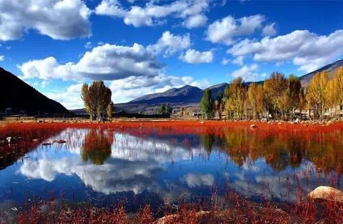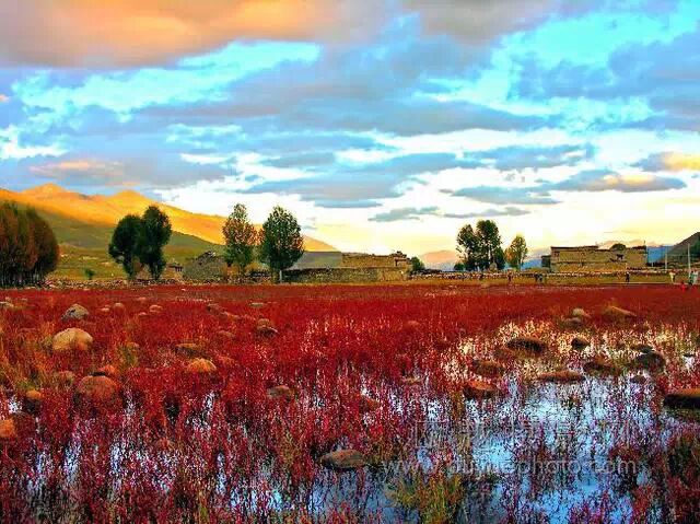 红草地这里是一片沼泽地,里面的水草因季节而变化,每年9、10、11月,水草呈现出浓重的红色,站在那里,感觉虽然没有在照片上那么鲜艳,但是,你的心一定会被第一眼看到的鲜红所震撼。