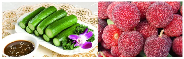 杨梅中含有丰富的维生素C,而黄瓜中含有维生素C分解酶。若将二者同时食用,杨梅中的维生素C会遭到破坏,失去原有的营养价值。